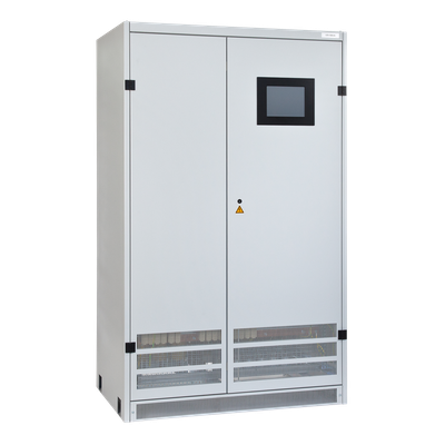 Type FW-5444-DB (3~) especially for railroad applications. Scope of application: With our frequency converters, which we offer with outputs of up to 500 kVA, AC consumers can be supplied with constant voltages, deviating from the input network. Frequency and voltage are adjusted to fixed parameters. Input and output voltage are galvanically isolated. The frequency converters contain the tried and tested components from our industrial UPS systems and are characterised by maximum reliability, clear design and ease of maintenance. In addition to the classic frequencies of 50 Hz, 60 Hz, etc., solutions for railway applications are often implemented with e.g. 16.7 Hz.