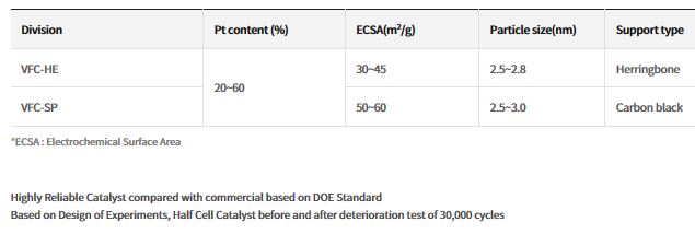 VINATech’s fuel cell catalysts are made of platinum, forming 2.5 to 3.0nm particles that are characterized by broad reaction areas and excellent corrosion resistance, which is suitable for applications that improve fuel cell’s performance and life cycle. VINATech’s fuel cell catalyst products proved to be highly resistant to corrosion in a holding test satisfying carbon corrosion conditions. VINATech’s fuel cell catalyst also demonstrated a low decrement of reaction area.