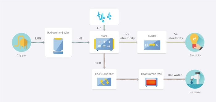 A fuel cell is a clean energy source that generates energy through the chemical reaction between hydrogen and oxygen (in the air). The power converter(Inverter) converts the direct currents generated in the stack to alternate currents. It is a highly efficient power generation system with its overall efficiency of 85%.
