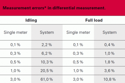 If a measured value is calculated from a number of individual measured values, this increases the error of the overall measurement in accordance with the Gaussian law of error propagation. With a high measurement accuracy of 0,1%, KRAL Volumeter achieve optimum system accuracy both for idling and at full load.