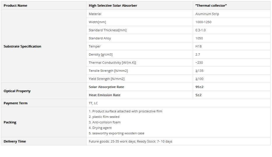 The key accessory of every solar collectors is the solar absorber. Its efficiency is given by a high absorpitve and low emission rate. SMMT high selective solar absorber "Thermal Collector is manufactured by advanced PVD coating devices, which achieve absorptive rate up to 95% and heat emission lower than 5%. It is also optimized to the wavelengths of sunlight with the high intensity to bring the maximum heating performance.