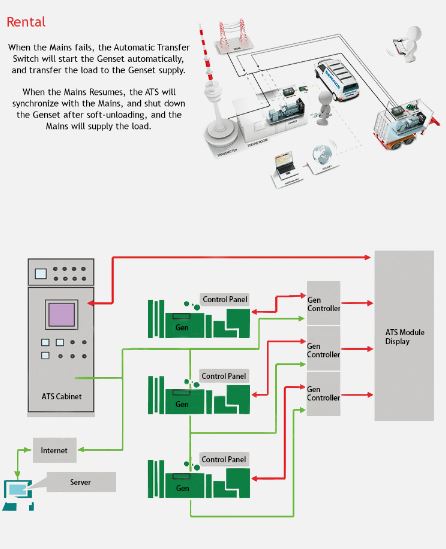 In the Standby and Renting system, a genset is used as a backup power supply. An automatic transfer switch (ATS) ensures the genset will start automatically when a mains failure signal is detected, decreasing or even eliminating the loss from a power outage. When the mains resumes, the ATS will detect and synchronize with it, then shut down after soft unloading and the Mains will resume supply of the electrical load. Automatic Transfer Switches are used widely in standby communications, renting, and mutual dual standby systems.