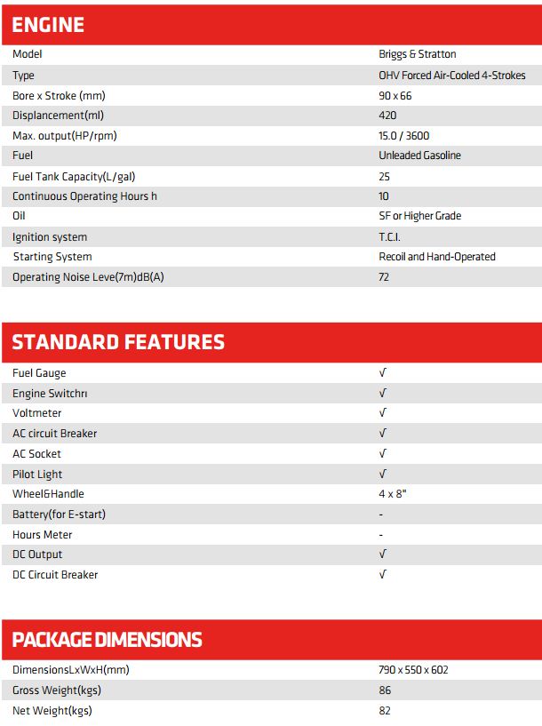 Type : Brush Single-Phase. Voltage Regulate : Automatic Voltage Regulator-AVR. Frequency(Hz) : 50. Rated AC Voltage(V) : 220. Rated AC Output(KVA) : 4kW. PeakACOutput(KVA) : 4,5 kW. Power Factor : COScp^l.