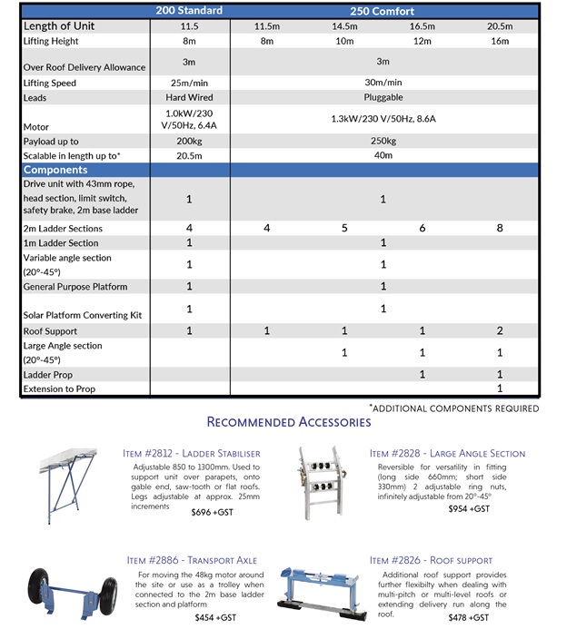 Two units are available: SolarLift 200 Standard and the SolarLift 250 Comfort. The load-bearing capacity depends on the ladder sections being used, their inclination, as well as their total length.
