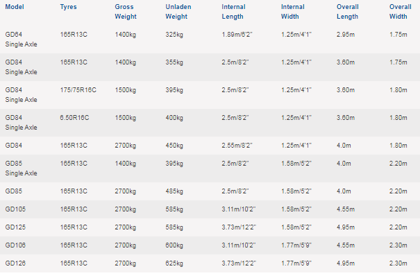 GD trailers are built around a welded steel, galvanized chassis with fixed front and side panels. These panels are constructed from formed galvanized steel and are supported by galvanized steel channel sections. The General Duty range is offered in width options from 1.23m/4’ to 1.71m/5’6" (internal width), and length options from 1.84m/6’ to 3.71m/12’2". All models are fitted with the Ifor Williams beam axle and leaf sprung suspension and either a tailboard or rear ramp with assistor.  Our General Duty trailers are available as single or twin axle and have a maximum gross weight ranging from 1400kg to 2700kg.