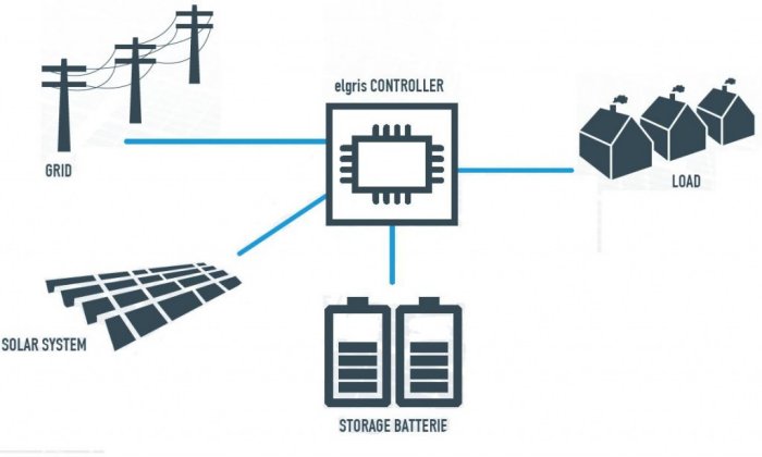 To overcome the additional fuel consumption and allow a greater solar penetration for the Diesel-PV hybrid system, elgris developed a new topology. The elgris inverters are DC coupled. This means that the generator and solar system are inputs for the elgris hybrid inverter and the output is made of an inverter.