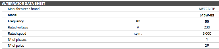 Cylinder diameter mm 70. Piston stroke: 54mm. Total displacement: 208cm3. Compression ratio: 8,5:1. Power max.: 7 (5.2)kW (HP). Max. torque: 12.4 Nm a 2.800 rpmN:m. Cooling system: Forced air. Ignition system: Electrical. Starting system: Manual. Fuel tank volume: 4,1liters. Air intake filter: Dry. Oil volume: 0,6liters. Oil level alarm: Yes. Lubrication: By immersion. Battery (fitted in factory): Not available.