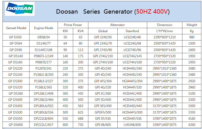 Doosan diesel engine meets the most advanced environmental protection standards in the world. In the long-term technical development plan, Doosan industrial products will meet the environmental protection requirements of TIER-3 and EURO-IV. Doosan generator system can provide multiple protection functions for oil temperature, water temperature, oil pressure, rotational speed, overload and so on. It can be used in lots of fields, such as engineering construction, reserve and emergency of building and factory, traffic, disaster prevention and relief, etc. There are four types for choice - open type, silent type, trailer type and rainproof type.