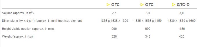 The GTC "Duisburg" developed especially for large housing complexes and is equipped with two deposit hatches on opposite sides of the container. Both deposit hatches are fitted with a lock to prevent unauthorized use. An identification system for source-related cost allocation is also available. An integrated solar panel and accumulator provide the system with electricity.