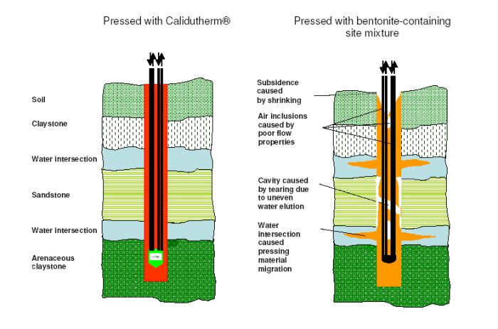 The flow properties of Calidutherm have been improved to such an extent that it produces a compression of the ring chamber of the ground heat sensor without cavities. The possibility of cavity formation caused by different swelling capacity or delayed water elution has been excluded. This means that completely encased ground heat sensors can be produced using Calidutherm. Calidutherm hardens much more quickly than conventional pressing materials. If the suspension comes to rest after the compression in the bore hole, the thixotropy which then takes place quickly ensures that small cavities are bridged. This counteracts the migration of the suspension in ground water. This therefore prevents the ground water suffering adverse influences. Drilling through ground water levels quickly separates them. Calidutherm allows ground heat sensors to be compressed into a permanently watertight state.