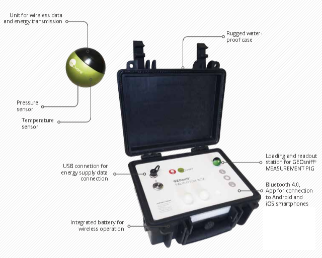 For manual or automatic insertion into the geothermal probe and measuring of a high-precision temperature-depth profile as well as the absolute depth of an geothermal probe. Charging the integrated energy store, transferring data and configuration is done with the VALIDATION BOX or with the GEOsniff AUTO BYPASS for continuous operation.