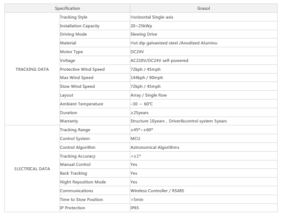 Multi-mode control function includes self-shading evading & adjusting mode, wind auto-protection mode and manual operations.In particularly,self-shading evading & adjusting mode during early mornings and late evenings allows compact design of tracker in limited space.
