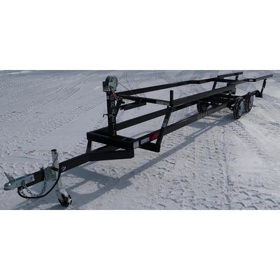 Center Lift. Fully assembled. Durable Attractive Finish. Worry-free LED lights. Base frame 2” x 4’ x 3/16 » wall steel tubing. 1200# swivel swing away jack with castor. Tandem Axle. 4.80-12, Four Ply, 990 lb. capacity.