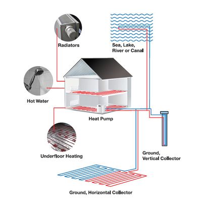 A ground source heat pump absorbs heat from the ground – by circulating water though piping in the ground – and transfers the heat into the building by circulating hot water though radiators, or underfloor piping circuits.