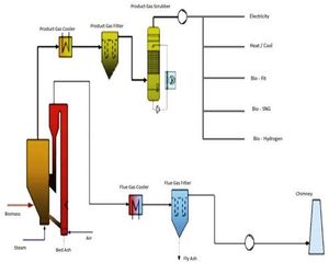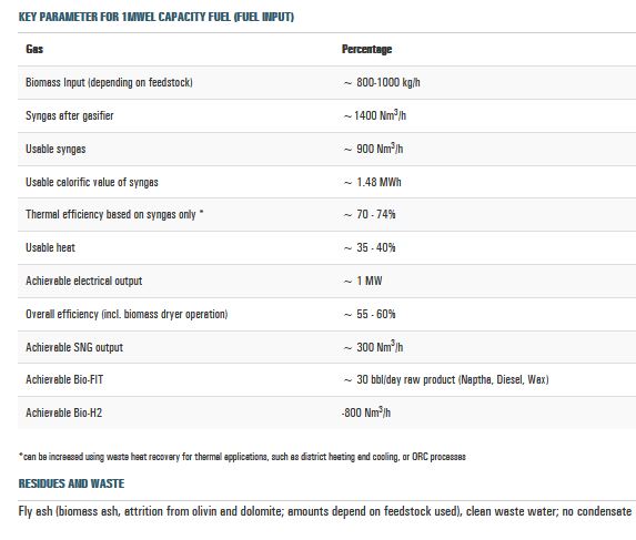 The Dual Fluidized Bed ( DFB ) Gasifier developed by Gussing Renewable GmbH (GRE) with the technology introduced by Vienna University of Technology, is considered as the most sophisticated process for the production of gas from renewable resources in the world and is state of the art. At the heart of the FICFB (Fast Internally Circulating Fluidized Bed) reactor are two interconnected fluidized bed reactors. In one, the gasification reactor, feedstock together with water vapor produces a nearly nitrogen-free, low-tar gas with high calorific value in a circulating fluidized bed at ~850° C. Coke from gasification and process residues, such as tar, are burned in the other,i.e. the combustion chamber, at ~930° C.