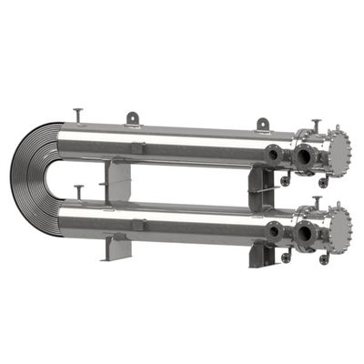 Shell and tube heat exchanger with U-tube bundle the legs of which are all sheathed: The shell tube system as a whole is bend back by 180° in case of this type, which shapes the heat exchanger as a hairpin. Such solutions are space-saving and are also suitable for media with large temperature differences due to their low thermal expansion. Hairpin heat exchanger are used, for example, for waste heat utilisation, exhaust gas treatment, evaporation and condensation.