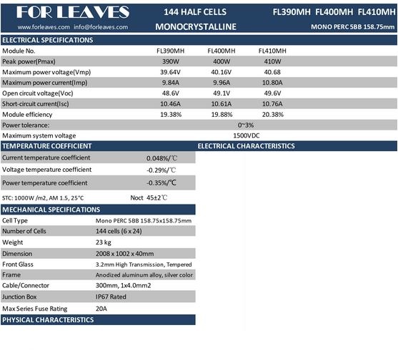 For-Leaves - Model 390W-410W -Half Cut Cell Solar Panel