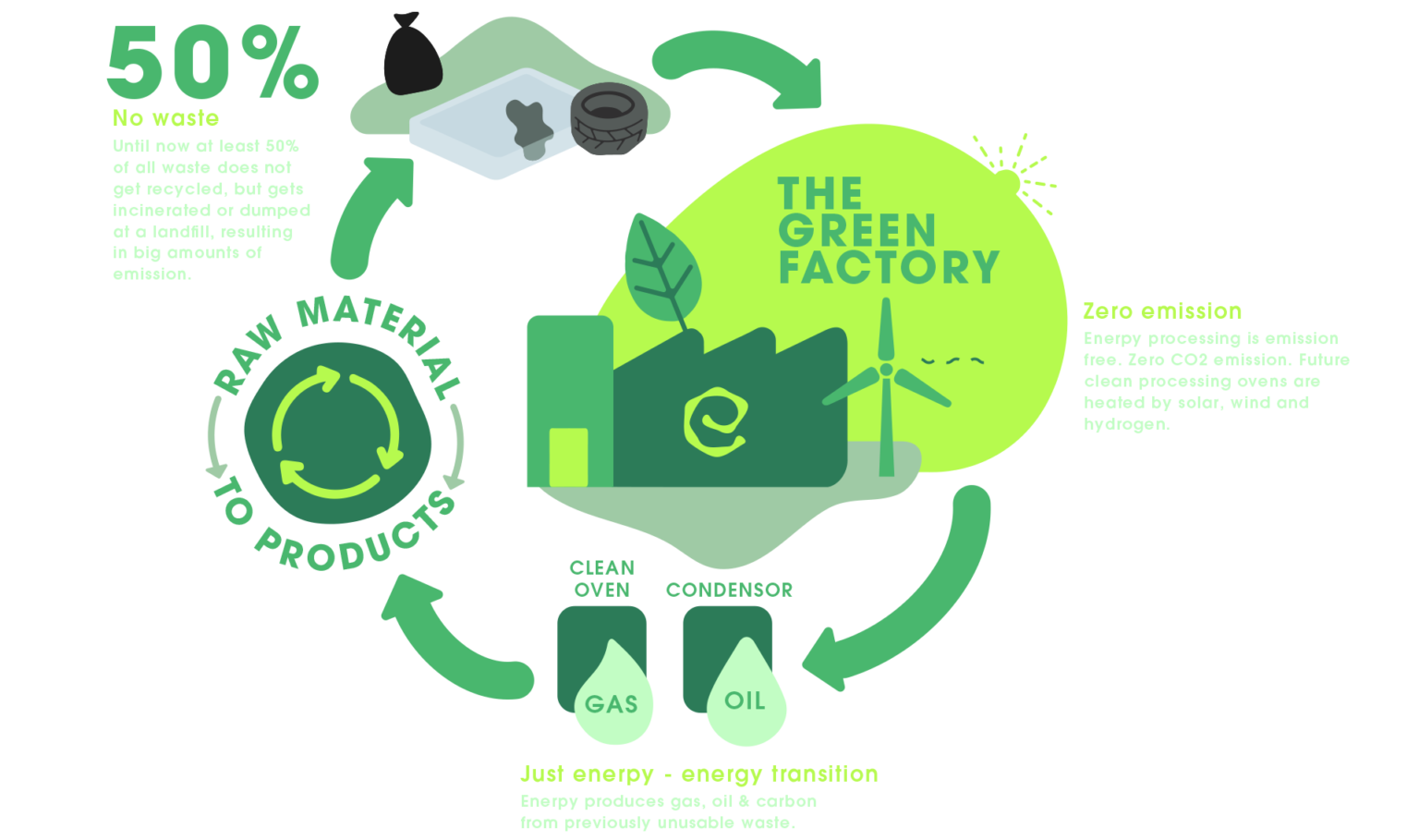 No more waste: Enerpy processes waste that nobody else processes or recycles. No more toxic, CO2 emitting export, landfills and incineration. Zero emission: Enerpy processing is emission free. Zero CO2 emission. The future clean processing ovens are heated by solar, wind and hydrogen. Energy transition: Enerpy transforms waste into high value syngas, pyrolyses oil and carbon for circular usability and steam for city heating and electricity generation.