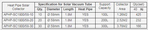 The heat pipe solar collector is connected with storage tank, electric control device, hot water mix unit and fittings for circulation and installation. The selective coating on the inner Cover of the evacuated tubes converts solar energy into heat energy and transfers heat to the heat pipes by aluminum fins. The liquid in the heat pipe changes into vapour which rises to the condenser. The heat then passes through the heat ex-changer and The vapor becomes liquid, returning to the base of the heat pipe. The heat conducts to the heat transfer liquid (anti-freezing liquid or water) via a copper pipe. This transference of heat into the liquid creates a continuous circulation as long as the collector is heated by the sun.