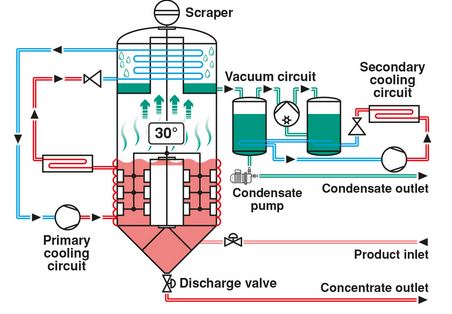 The heat pump evaporators of the HP R series are ideal for meeting the need to obtain very high density concentrates and for the evaporation of products that are extremely encrusting to heat exchangers. By means of an automatic motorized scraper, which continuously keeps clean the exchange surfaces of the boiling boiler, it is possible to obtain higher concentrations than other evaporative systems, while avoiding the deposit on the exchange surfaces. The final concentrate will be finally discharged by means of pneumatic pumps of diaphragm type or of single screw type. It is also possible to place the system above a lifting frame, so that the discharge through the bottom discharge valve can be carried out directly into a crystal separation system.