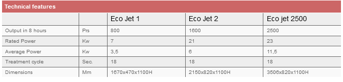 ECOJET is a heat setter for ironing and stabilization of the shoe with forced humid hot air, located after the heel seat lasting. Thanks to a technological innovation, Ecojet replaced Turbojet, recognized around the world for its reliability and its excellent results. The heat treatment is made by NIR infrared lamps, that allow a very fast treatment, avoiding heat accumulation inside the last and therefore with an important reduction of the power consumption. The system is suitable for both shoes and boots production and could be used both next to traditional conveyor systems and in Rink systems. Ecojet is available in two versions: with one channel (Ecojet 1), two channels (Ecojet 2) or in the version Ecojet 2500, for producing 2500 pairs of shoes in 8 hours.