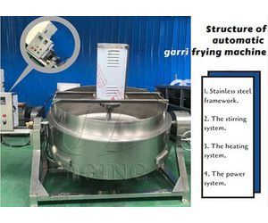 The fryer is equipped with two stirring shafts that rotate at different speeds, ensuring thorough mixing and even heating of the garri.