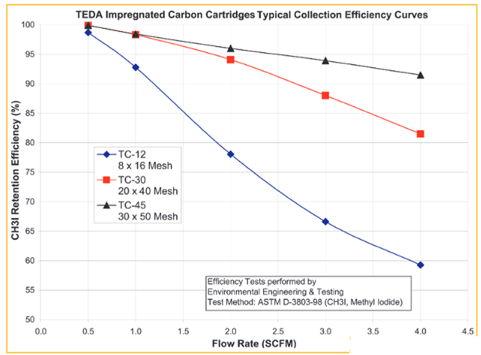 “What is the retention efficiency of Radio Iodine or Xenon on Carbon and Silver Zeolite?” The reason the question is asked, is because133Xe is also a by-product of nuclear fission. In the Journal of Health Physics, it is stated that when Carbon and Silver Zeolite are dosed with 133I and 133Xe, tests show that 0.03 to 0.5% of the original concentration of133Xe will be retained on 40x50 mesh TEDA impregnated carbon. Silver impregnated Zeolite was found to have retained 1/15,000th the amount of 133Xe as that of the Carbon. The lower the retention or capture of 133Xe on a collection media such as silver zeolite, the lower the possibility of misinterpreta- tion of collected radioactivity as being attributed to anything other than the iodine species.