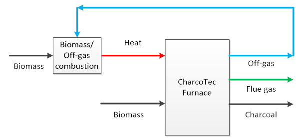 In the figure the principle of the CharcoTec process is depicted. For heat generation during start-up a wood stove is used in which wood or other biomass is combusted. The hot flue gases from the wood stove enter the CharcoTec furnace and heat the dried biomass in the carbonisation unit. During heating of the biomass off-gases are produced containing lighter and heavier hydrocarbons. This gas stream is directed back to the wood stove and combusted. Hereby emissions to the atmosphere of these hydrocarbons are prevented and the caloric value of the gases is used for the carbonisation process. After start-up the caloric value of the off-gases is sufficient for maintaining the process temperature at the desired level. Utilising the caloric value of the off-gases increases the overall process efficiency.