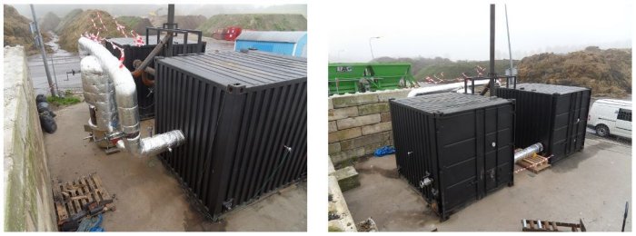 Based on these test results and supported by the theory CharcoTec constructed a second test kiln or better a first demonstration kiln, which is operated on a site near by the city of Groningen in The Netherlands. The installation consists of two gas-tight containers, two furnaces and a wood-fired stove. During the batch-wise operation one of the two containers is utilised for drying fresh wood, whereas the other container is used for carbonisation of the dried wood.
