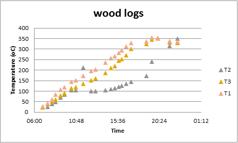 The temperatures in the graphs were measured at different positions in the reactor. From T2 it can be seen that the temperature in centre the reactor remains at ca. 100oC up to the point that the wood logs are dried. After that the temperature in the reactor increases relatively fast to the temperature in the container. From these tests it becomes obvious that a large part of the total process time is taken for drying the biomass; depending on particle size up to several hours. Once the carbonisation process starts the caloric value of the evolved gases is sufficient to maintain the process temperature in the reactor; the propane supply was stopped. The efficiency (dry biomass to charcoal) is ca. 35%. The quality of the charcoal was found to be within the standards for BBQ charcoal.