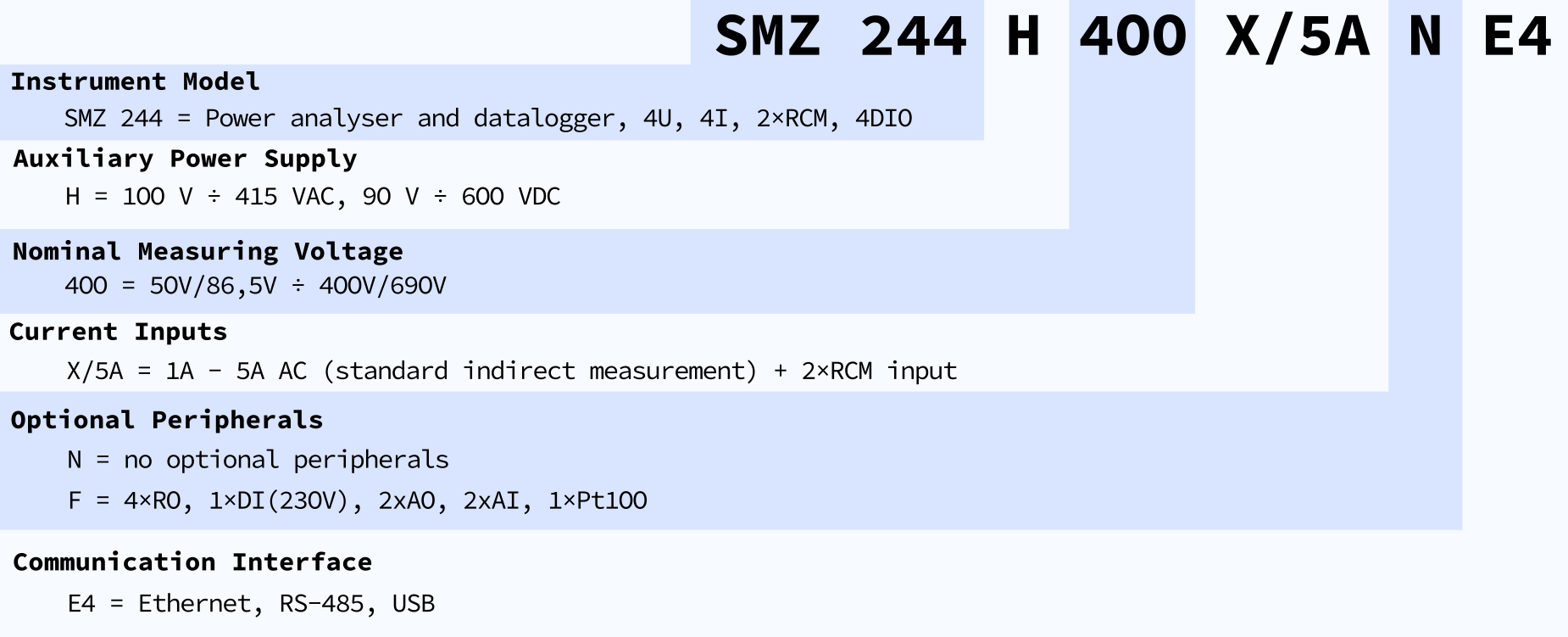 High-end class A PQ analyzer and data logger, 0.2S sub-meter, residual current monitor (RCM) with 5.7" color graphic display, wide offer of additional inputs and outputs, panel mounted in 144x144mm. SMZ 244 is a high end class 0.2S energy meter precise analyzer intended specially for use in industrial automation, smart grids and other demanding projects. It can work as a standalone unit as well as a control and display unit for other simpler slaves (see modbus master firmware module, MM). Measurement inputs are designed for CATIV/300V networks.
