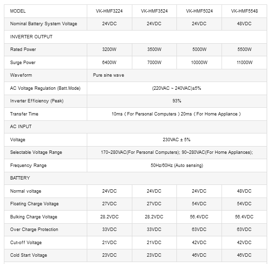 VK-HMF series hybrid solar inverter is with multi-functional inverter/charger, combining functions of inverter, MPPT solar charger and battery charger to offer uninterruptible power support in portable size. Its comprehensive LCD display offers user-configurable and easy-accessible button operation such as battery charging current, AC/solar charger priority, and acceptable input voltage based on different applications. It can work without battery on sun day.