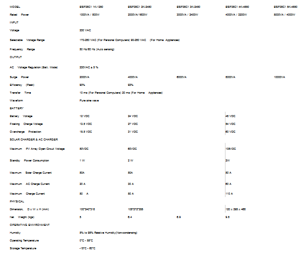Pure sine wave inverter. Cold start function. Auto restart while AC is recovering. Overload and short circuit protection. Optional remote panel available. Selectable charging current based on applications. Configurable AC/Solar input priority via LCD setting. Compatible to mains voltage or generator power. Smart battery charger design for optimized battery performance. Parallel operation with up to 6 units only available for 4KVA/5KVA. Selectable input voltage range for home appliances and personal computers.