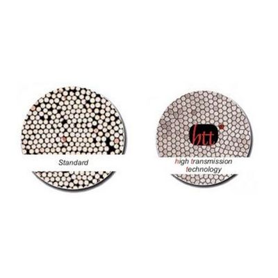 With HTT-Blue-Line® cables, the optical fibers are melted and pressed in at the light entry by a special procedure; the fibers are hexagonally deformed; the spaces in between disappear, and the glass share adds up to 100%. The transmission increases proportionally. Since there are no organic adhesives anymore, these new fiber optic cables no longer “burn” at the light entry, which used to be a typical cause of failure with conventional cold-light cables; so the high-performance fiber optic cables are extremely temperature resistant at the point of light entry. Owing to the melting and pressing, the optically active diameter of a 3.5 fiber optic cable is reduced to around 3.2mm (actually root of [3.5 x 3.5] x 80% = 3.13).