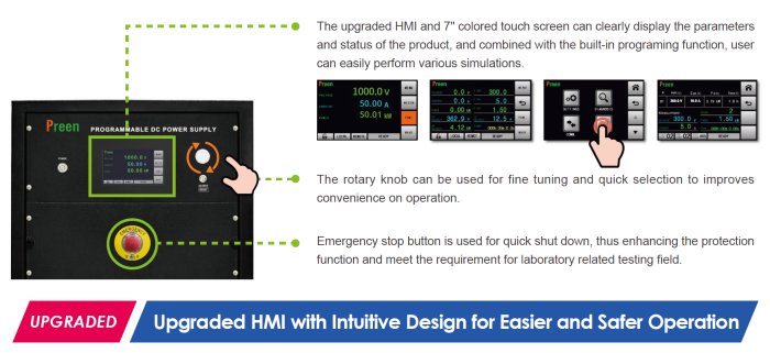 Preen's ADG+ series is an upgraded high power DC power supply, featuring low ripple, high accuracy and fast response. It can simulate various characteristic of solar array with the optional I-V curve function. The Output power is up to 300kW per unit with the patented modularized design and easy mater-slave parallel operation, With the output voltage up to 2000V, making it the ideal choice for applications like EV motor, DC/DC converters, ESS and inverters.