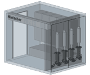 The ultrasonic processor UIP10000 was designed with the dimensions of standard freight containers in mind. Unlike the UIP16000, the UIP10000 allows for a vertical setup of the transducer, together with sonotrode and flow cell in a standard sea freight container. Therefore, a container can be equipped with a cluster of UIP10000 including generators, transducers, sonotrodes, flow cells and closed loop cooling. In addition to that, a typical turnkey sonication system can hold, pumps, piping, valves and a data-interface. Such a 10ft or 20ft container facilitates transportation, setup and start-up at the customer site. Typically containers come with noise-insulated walls to reduce the noise emissions outside of the container.