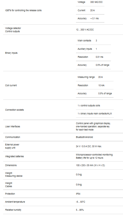 ACTAS BTT features one output for controlling the OPEN coils and one output for controlling the CLOSE coils of a switchgear device. Both outputs can be used to control DC- and AC-operated coils. The determination of operating times can be carried out simply and reliably on up to three main contacts by triggering C, O and CO switching operations. The clear graphical display shows the corresponding operating times for all the binary inputs as the result.