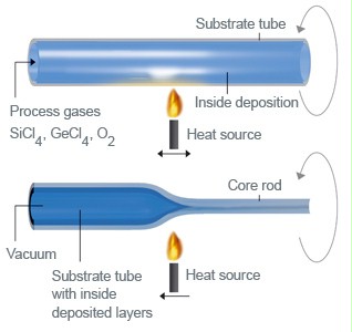 Heraeus substrate tubes are the premier choice for production of core rods for single mode, multimode, and specialty optical fibers. Our tubes are utilized in MCVD (Modified Chemical Vapor Deposition) and similar deposition processes used to manufacture core rods. The core material of the final fiber results from the deposition of multiple layers of pure and Germanium doped fused silica on the inner surface of the substrate tube. Oxygen-hydrogen burners (MCVD), electrical furnaces (FCVD) or plasma torches (PCVD) can be used as energy sources for these chemical deposition processes using Heraeus’ substrate tubes. Once the core material is deposited, the tube is gradually collapsed into a solid core rod under high heat and vacuum.