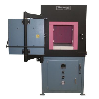 The Dual Chamber Tool Room Furnace displayed here has a temperature capability of 1260°C (2300°F) in the upper chamber and 677°C (1250°F) in the lower chamber. Shown with optional roll-out quench tank, roller hearth and pneumatic door opener.