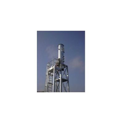 The LAMBDA landfill gas flare is used to combust the methane or sludge gases arising from anaerobic processes in landfills.  Combustion takes place from the lower edge of the flare cap with a high level of excess air  at a temperature of at least 1,000 °C. The flare cap has inner ceramic fibre insulation which can withstand temperatures of up to 1,430 °C. Lamellar air valves ensure a constant combustion temperature. The air not required for the chemical conversion serves as cooling air. Air supply is effected by the natural draught principle. The surface turbulent burner ensures thorough mixing of the combustion air with the respective gas so that the control temperature is achieved in the lower section of the flare cap. This guarantees a homogenous temperature istribution in the combustion chamber.