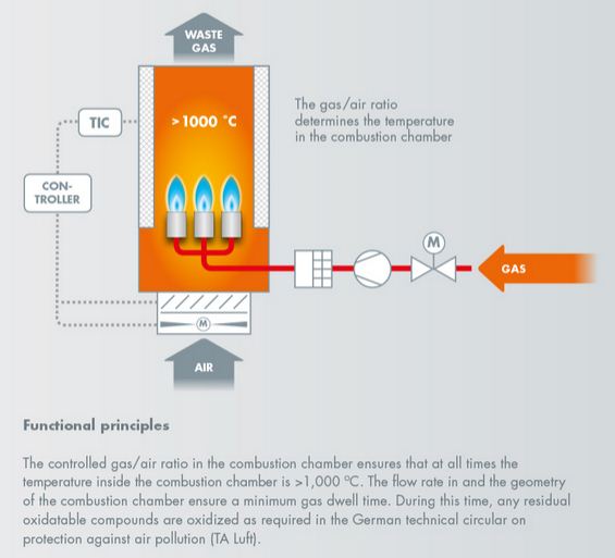 The controlled gas/air ratio in the combustion chamber ensures that a temperature of >1000 °C is always maintained in the combustion chamber. The flow rate in and the geometry of the combustion chamber ensure a minimum gas dwell time. During this time, any residual oxidizable compounds are oxidized as required in the German technical circular on protection against air pollution.