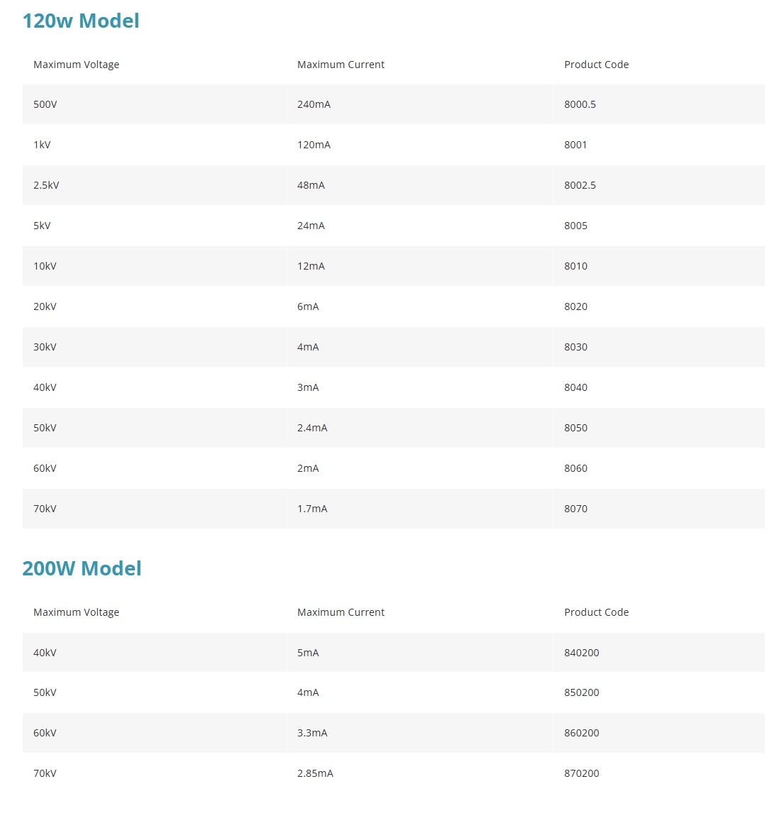 The Genvolt 8000 series, High Voltage DC Power Supply, is a rugged modularised range of AC input DC High Voltage units that are designed to operate from a universal mains input from 85VAC to 256VAC 50/60Hz. Power Output options are available from 500V to 70kV at 120W and 49kV to 70kV at 200W.