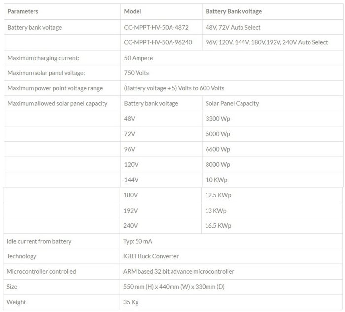 - Battery charge current limit: In case the inverter is drawing current, CC-MPPT-HV-50A is capable of supplying full 50 Amp charging current. However, in case inverter is not drawing any current, the charging current to the battery can be limited to 15 or 20A (User programmable)