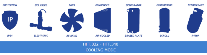 HFT SERIES consists of a reversible air-cooled heat pump designed to ensure an high performance also in case of low ambient temperature, down to -5°C. These units are designed for applications that require reliability, continuity of operation, temperatures stability, and guarantee minimum consumption and high energy savings.