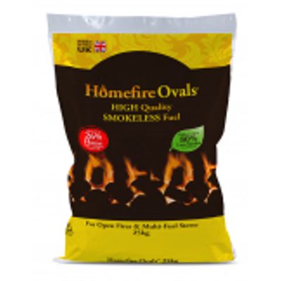 One of our most popular smokeless coals for use on open fires and multi-fuel stoves, Homefire Ovals last up to 40% longer than house coal, and produce up to 80% less smoke. Homefire Ovals also generate up to 30% more heat than house coal, and their oval shape allows them to pack together tightly, giving a steady burn and warmth for hours on end.
