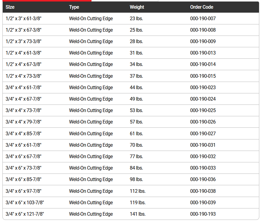 High carbon, single-bevel steel cutting edge. Pre-cut lengths in many sizes. Welding the end pieces creates a strong, straight corner. You control the spacing of the end pieces to ensure a proper fit. Quick install.
