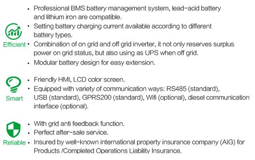 The iMars BD series system is a new generation of photovoltaic energy storage products based on the idea of intelligent and maintenance free, which integrates many functions such as charging, energy storage and photovoltaic inverter, BMS battery management system and so on. It can automatically identify the off grid / grid connection mode and connect to the smart grid to achieve peak load and valley demand.