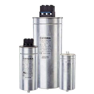 Power Factor Correction (PFC) capacitors are used for reducing the reactive power which is created by production machines and stresses the grid. This type of capacitor is used worldwide. Hydra produces 1 or 3-phase cylindrical PFC-Capacitors up to 50 kvar. All capacitors are equipped with an overpressure fuse and filled either with oil or gas for highest quality and safety.