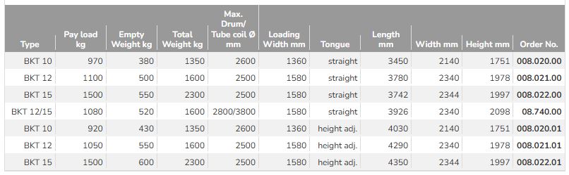 The BKT 10 – 15 gets loaded by a tilting frame which is operated by a manually operated hydraulic pump and two double acting hydraulic cylinders. Upon request, all trailers may be delivered with extendible loading jibs for picking up tube reels, for BKT 10 serially. Larger diameters of pipe coils than mentioned for the cable drums can be transported with that additional extensions.