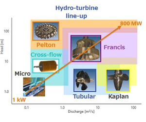 The main types of hydro-turbines include pump-turbines for pumped-storage power generation, Francis turbines for moderate to high head, Kaplan turbines for low to moderate head and bulb turbines (that utilize the head energy of water as pressure) for low head, and Pelton turbines (that directly utilizes potential energy as rotational energy) for high head.